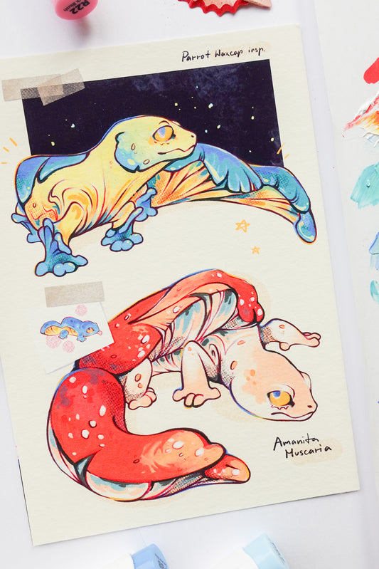 "Mushroom geckos blue and red" print